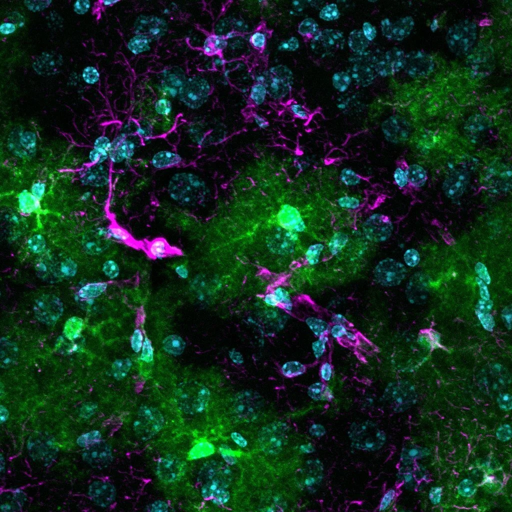 Confocal image: astrocytes labelled with eGFP (green), GFAP (magenta), DAPI (blue).